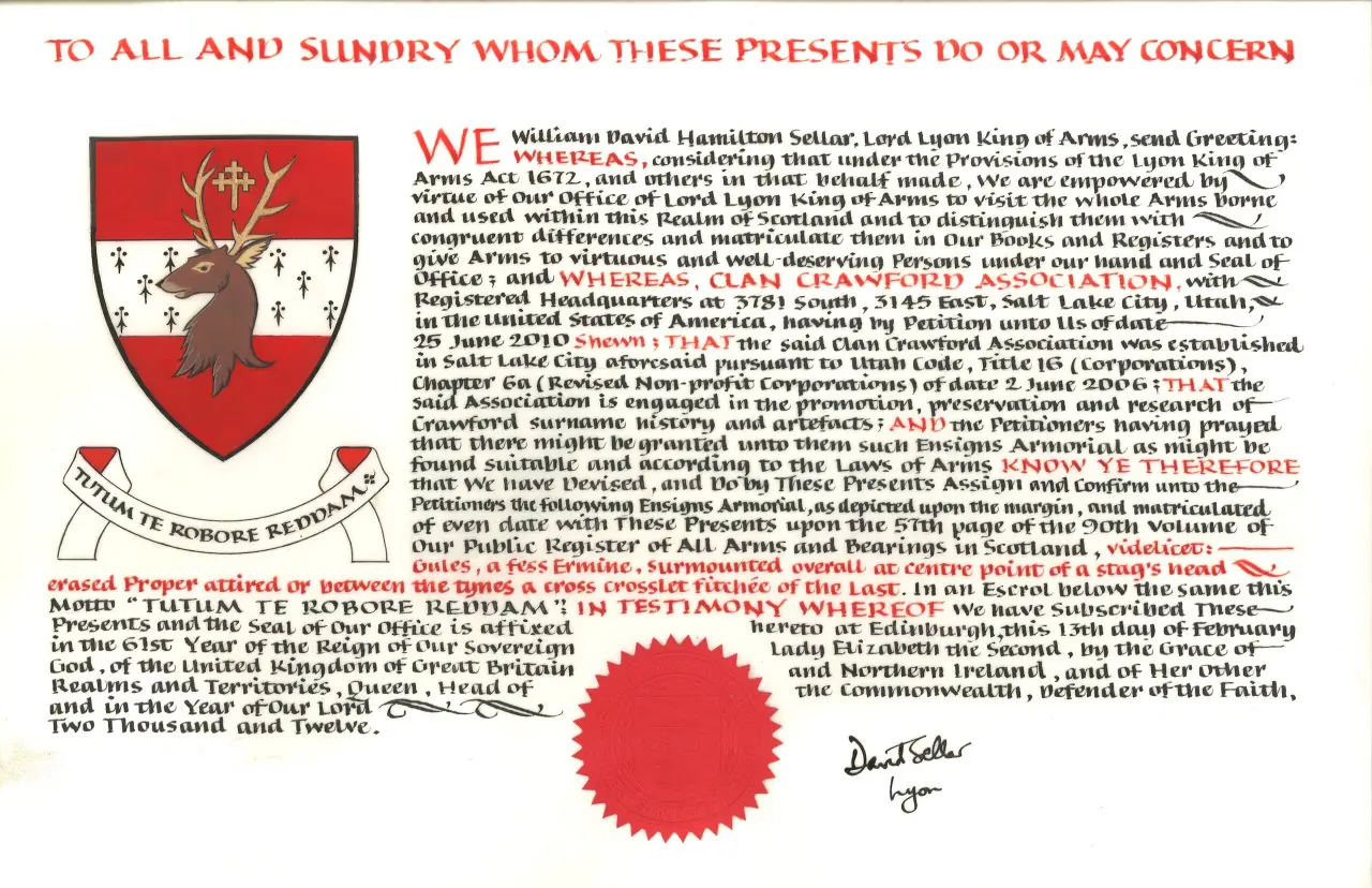 Welcome to the Clan Crawford Association (CCA), The Association was incorporated in 2006 and is also legally registered under the the name “The House of Crawford“. We are a member of the Council of Scottish Clans and Associations. In 2012 we were issued Letters Patent from the Court of Lord Lyon of Scotland granting coat of arms that integrates the designs of the two main branches of the House, Crawfordjohn and Dalmagregan.
