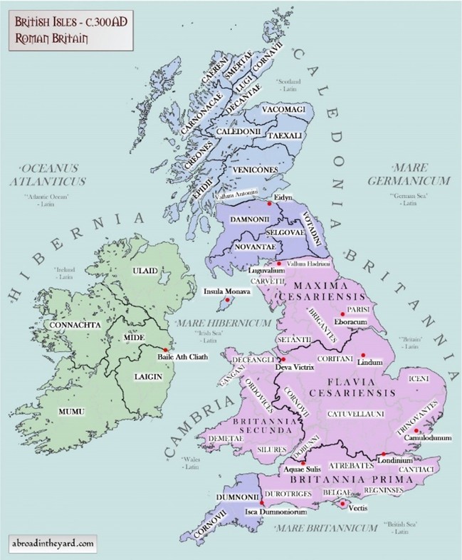 The Romans encountered various Britannic Celtic tribes in Britain. A map of these tribes is provided to help the reader trace the movements of the Romans as they encountered these tribes.Figure 2. British Isles Circa 300 A.D. The conquered area in pink was held permanently. The area in purple south of the Firth of Fourth was occupied and then fluctuated in influence and was contained by Hadrian’s wall on the south and Agricola’s wall on the north and stopped at the highland shown in blue. Ireland in Green was never attacked by the Romans